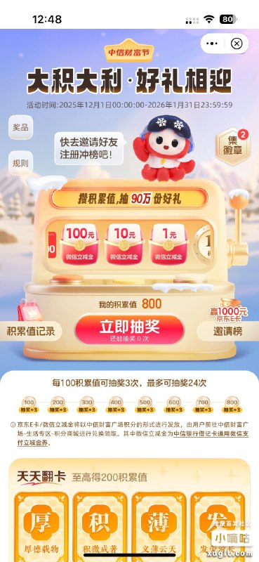 中信财富节任务抽奖积分换立减金1:115比例